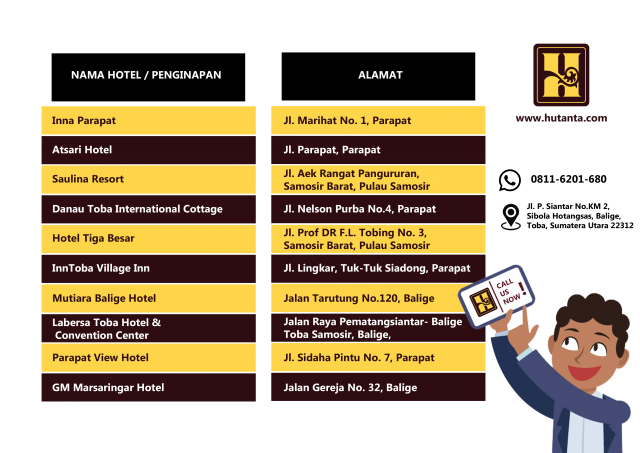 Baca Lebih LanjutHutanta menyediakan layanan perjalanan keliling Danau Toba, makan siang di kapal, dan atraksi menarik lainnya.