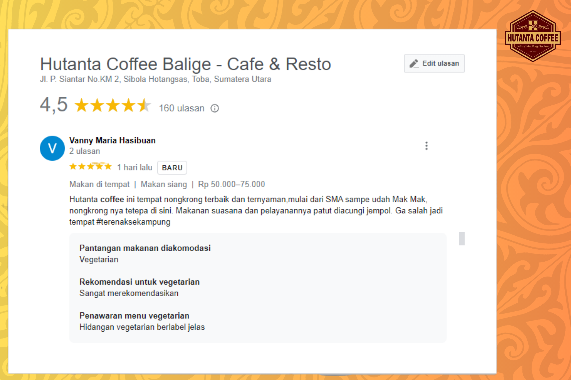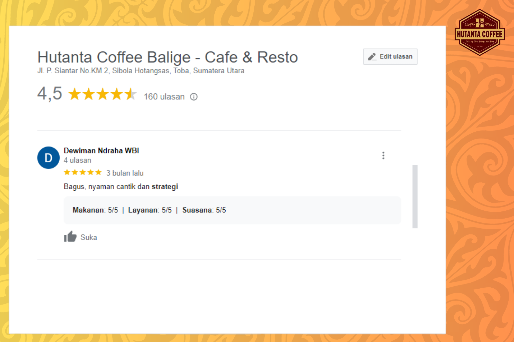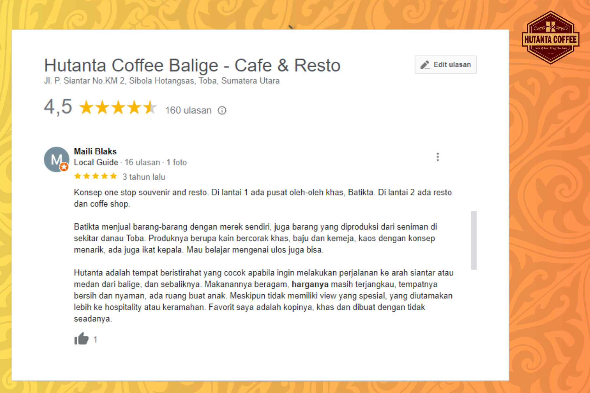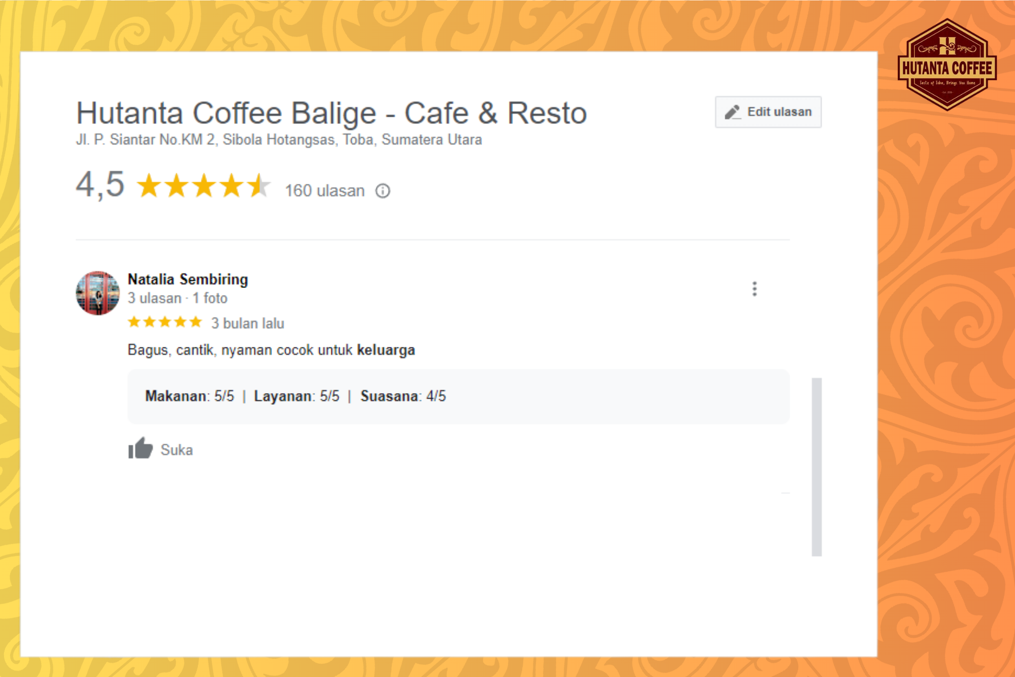 Kali ini, ada beberapa review dari tamu yang disampaikan Google map, yang mungkin bisa menjadi pertimbangan saat kamu ingin datang ke Hutanta Coffee.